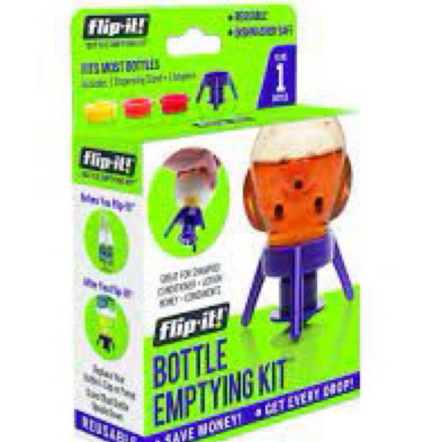 Flip-It! Bottle Emptying Kit solves the problem of getting every drop out of thick liquids in bottles that are in the household, garage or workshop. The Flip-It! helps stretch your dollar and supplies on products such as: car wax, condiments, conditioners, creams, glues, hand sanitizer, lotions, oil, polishes, shampoo, soap and more! Easy to use, the Flip-It! allows gravity to do the work. Simply replace the existing cap or pump with Flip-It! and turn that bottle upside down. Open the push/pull valve and squeeze out every drop.
