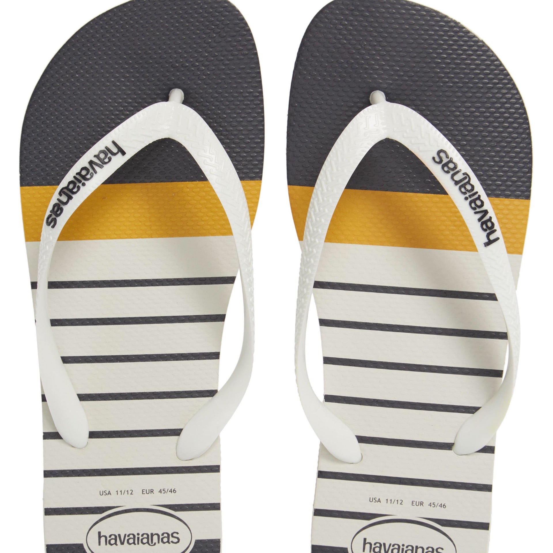 Set sail in the Top Nautical flip flop! Featuring a white, yellow, and navy stripes on the sole, navy straps, and a yellow Havaianas logo.