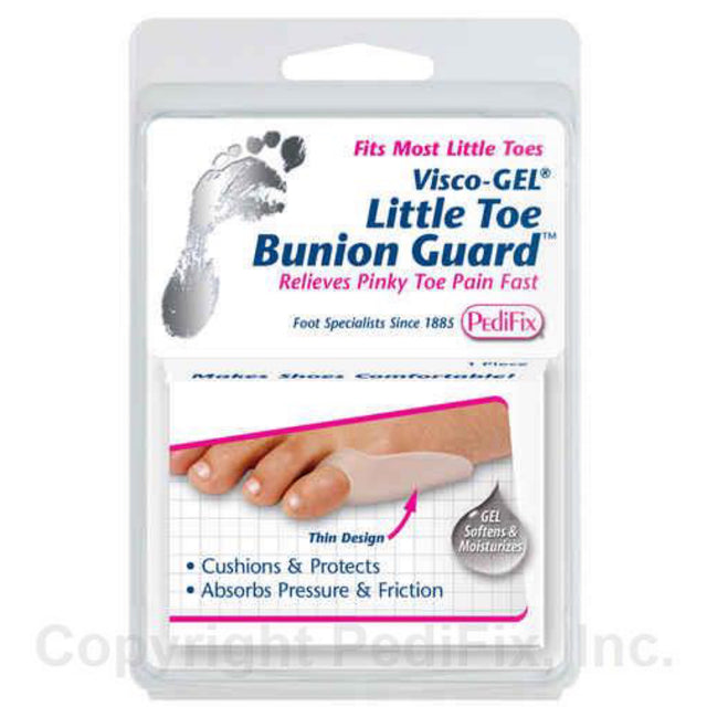 Doctors often call an irritation at the base of the little toe a ‘Tailor’s Bunion’ or ‘Bunionette’. PediFix Visco-GEL Little Toe Bunion Guard helps protect this sensitive area. Proprietary Gel soothes and softens. Thin profile fits comfortably in most footwear.