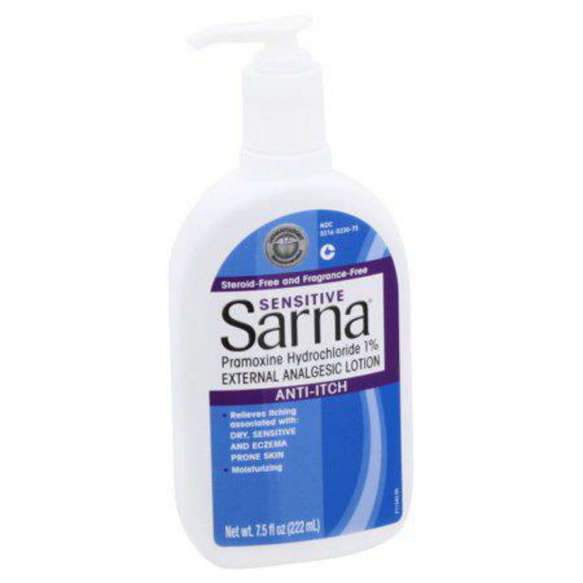 Sarna Sensitive Anti-Itch Lotion relieves itching associated with: Dry, sensitive skin; Eczema. The formula contains Pramoxine Hydrochloride 1% to effectively relieve itching. It is both steroid-free and fragrance free. The formula is dermatologist recommended and suitable for all skin types. It also provides a soothing and moisturizing effect. Easy to use formula. Made in U.S.A.
