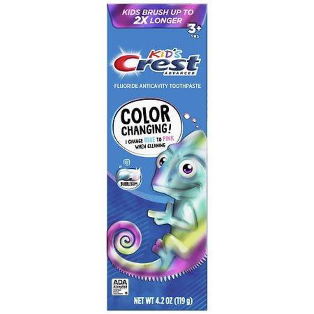 Make their smiles as bright as their futures with Crest Advanced Kid's Fluoride Toothpaste, the #1 dentist-recommended toothpaste for kids. Crest Chameleon Toothpaste changes color from blue to pink after 2 minutes, helping them brush up to 2X longer. Crest helps protect kids' teeth as they transition from toddler to adolescence by helping them establish an oral care routine at an early age. Crest toothpaste contains fluoride to promote healthier teeth and fight cavities while making brushing fun with its yummy bubble gum flavor.