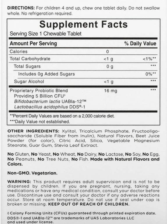 Probiotics provide a source of good bacteria, the wholesome kind children need to contribute to positive microflora in their bodies. Probiotic Kid chewables are created with children ... and parents in mind. Sugar-free and vegetarian, our natural Strawberry Vanilla flavored Kid chewables taste so good kids will want to take them; parents can feel good that they contain natural flavors and colors sourced from foods, with the added benefit of teeth-friendly Xylitol.