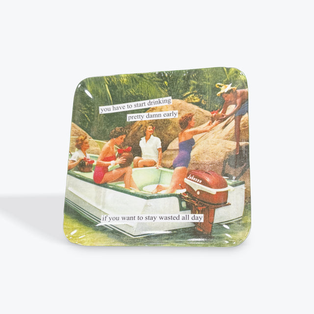 Anne Taintor's funny and cute plate features the humorous quote, 'you have to start drinking pretty damn early if you want to stay wasted all day.' Add a touch of wit and charm to your tableware collection with this delightful piece.