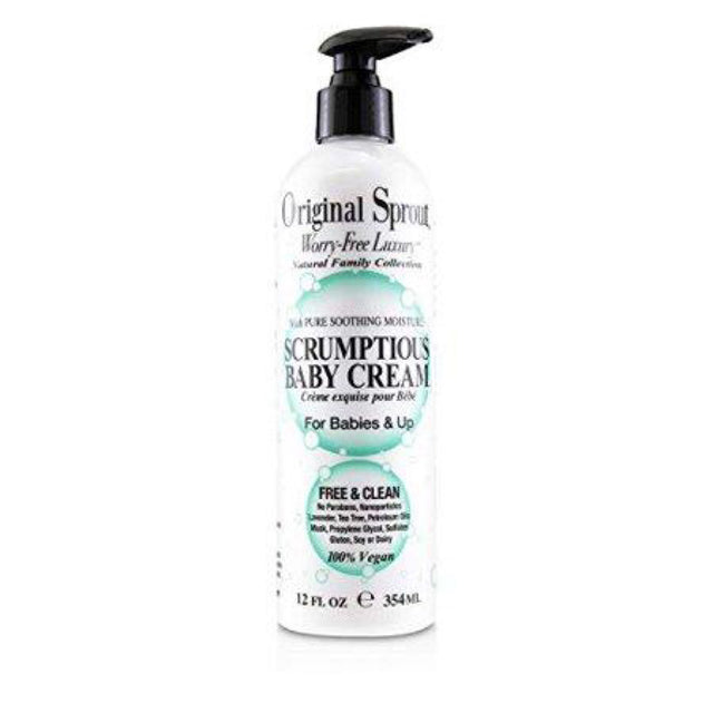 Moisturising Scrumptious Baby Cream by Original Sprout, suitable from birth. It is 100% vegan, gentle on the eyes and is suitable for delicate skin. Apply as often as required, especially as an after bath treat and calming massage cream.