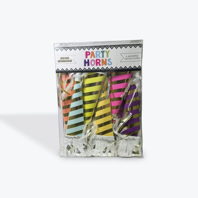 These Fringed Party Horns are perfect for brightening up your party table and ensuring your guests can show off their inner musician. This pack of six features gold, mint, and pink horns, each decorated with cheerful fringing and decadent gold foil!.