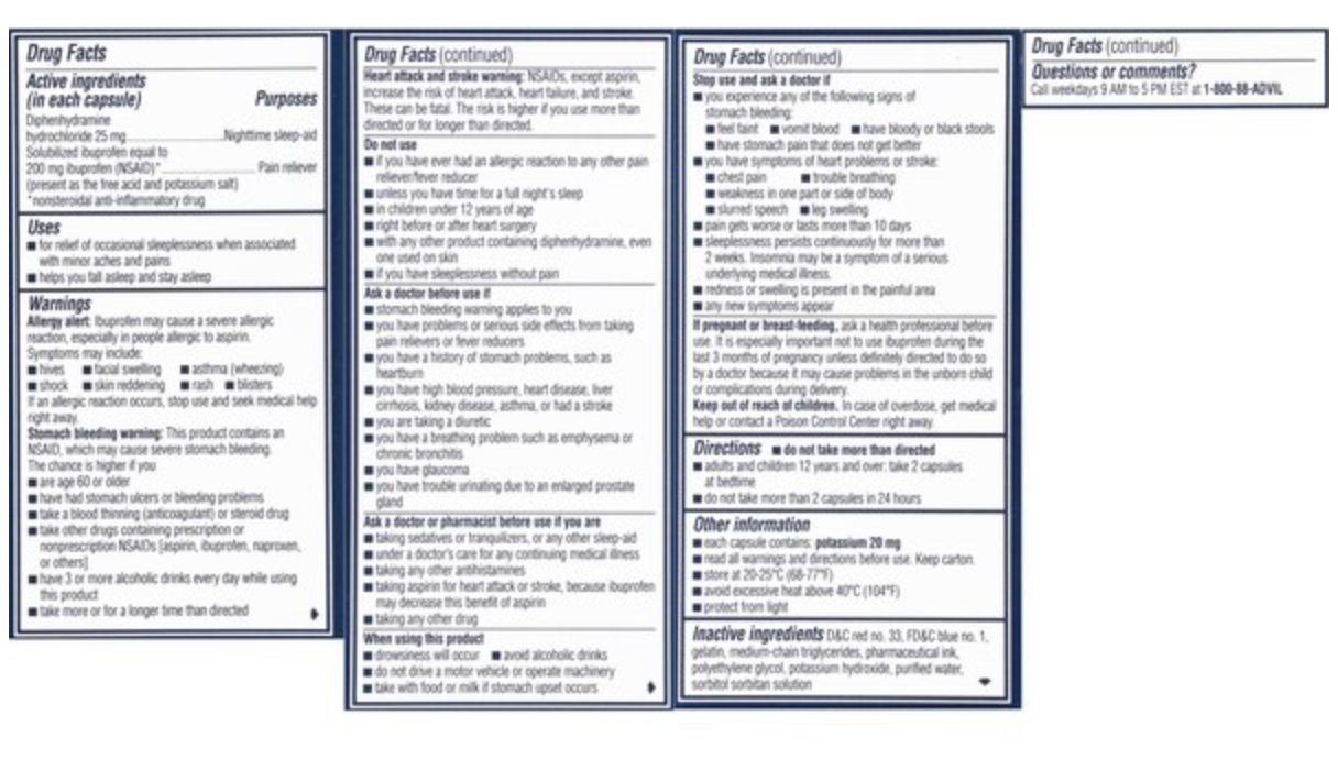 Advil PM Liqui-Gels combine the #1 ibuprofen brand plus the #1 sleep ingredient to give you fast pain relief and a whole night's sleep. Non-habit forming Advil Liqui-Gels help relieve occasional sleeplessness associated with minor aches and pains. Each liquid filled capsule contains ibuprofen 200 mg, a headache relief and joint pain relief medication, and diphenhydramine 25 mg, a nighttime sleep aid that helps you fall asleep. This pain reliever delivers real liquid power to rush relief where it hurts. Get ready to head back to college with confidence with Advil.