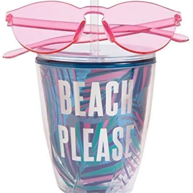READS "Beach Please"; silver lettering on navy and multi-color leaf tumbler, clear lid and straw with pink tinted sunglasses