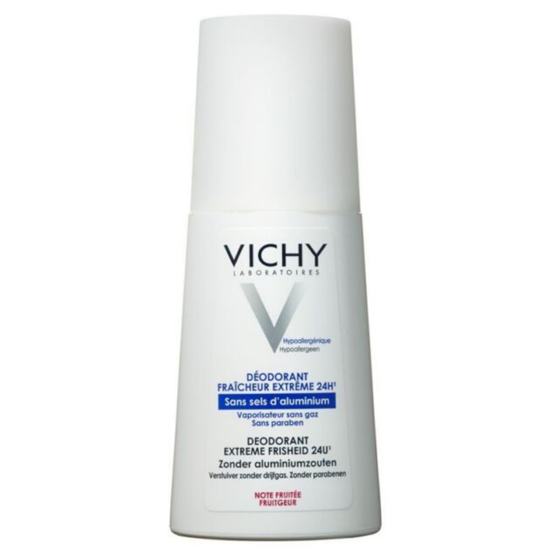 Vichy Extreme Freshness Deodorant 100ml is an anti-odour deodorant, ultra fresh acting until 24 hours.After application, it leaves no white marks on the skin and leaves a pleasant and light perfume of red fruits on the skinFree from aluminum salts. Hypoallergenic.
