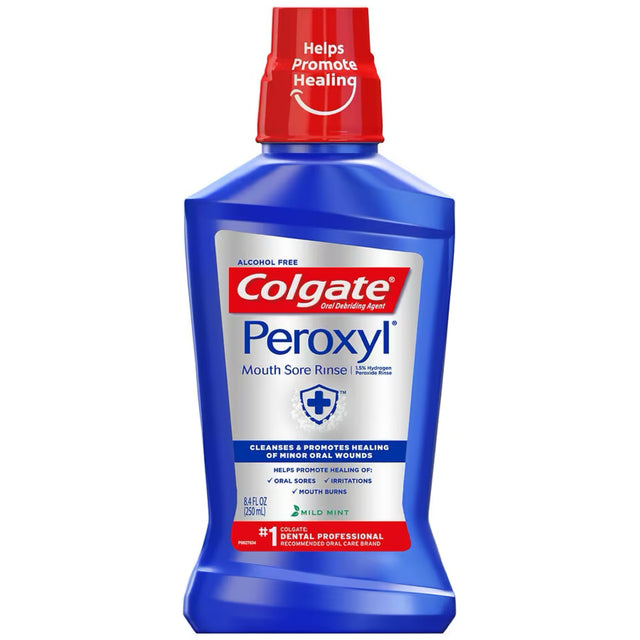 Colgate Peroxyl Mouth Sore Rinse helps cleanse and promote healing of minor oral irritations. Peroxyl's oxygenating action helps removes oral debris to facilitate healing of oral sores, irritations and mouth burns. Peroxyl also soothes minor gum inflammation from dental procedures, dentures and orthodontic appliances. This great-tasting formula is alcohol free.