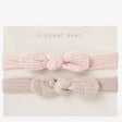 Soft organic muslin bow wrap style, elasticized 2 piece set Presented on header card Fits babies 0-12 months Wipe clean as needed